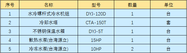 清遠皮革廠壓花機橡膠輥冷卻,通過工廠技術人員核算,需要配120HP水冷螺桿式冰水機組2臺,客戶直接百度水冷螺桿式冰水機找到東躍進制冷,通過幾天的電話及文字溝通確認,最終訂購2臺120HP水冷螺桿式冷水機組以及輔助設備,型號及數量如下表: